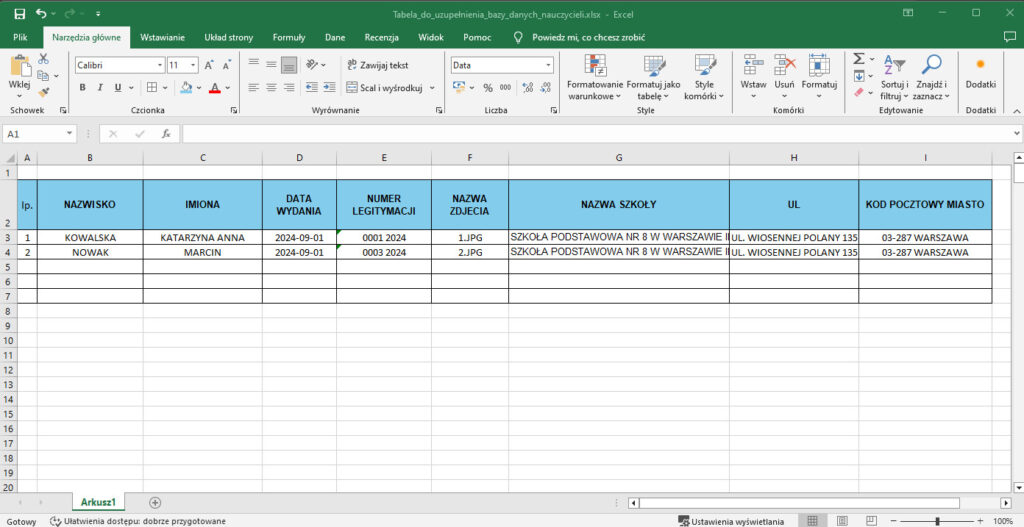 w utworzonym folderze (np. photo) zapisujemy wszystkie zdjęcia nauczycieli (nazwa każdego pliku ze zdjęciem to „lp.” przypisana do nauczyciela z pliku arkusza kalkulacyjnego)